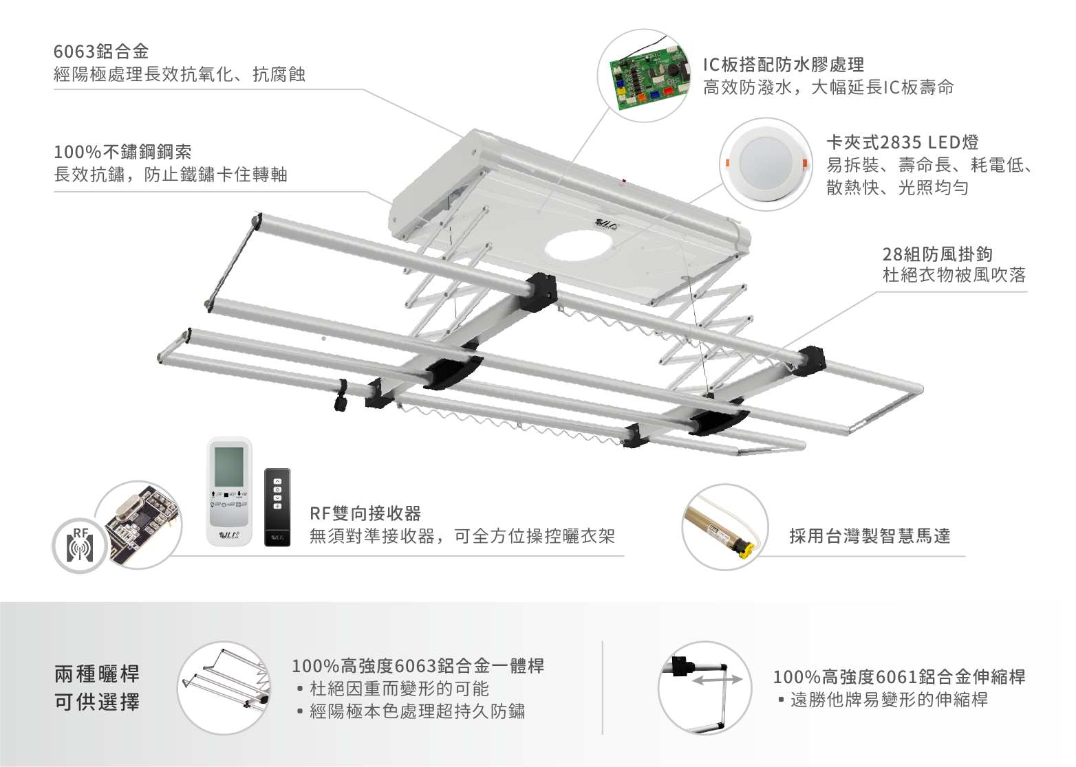 防風掛鉤 台灣製造高強度6061鋁合金伸縮式晾桿,遠勝他牌易變形伸縮桿,附有多達28個防風掛鉤,讓您晾曬衣物更加自由便利。