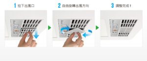 豪華照明型300 系列面板搭配三組出風口,不必使用任何工具,向下拉出並旋轉即可輕鬆改變出風方向,均勻吹出暖風,提升浴室整體循環效果。